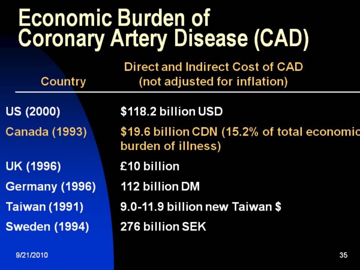 American Heart Association, 2000 Heart and Stroke Statistical Update; Cardiovascular Division - Laboratory Centre for Disease Control, Health Canada1996; Help for Health Trusts’ NHS ATOZ HELP-DIRECT Website; Klever-Deichert et al. Z Kardiol. 1999;88:991-1000; Yang et al. J Formos Med Assoc 1999; 98:394-402; Zethraeus et al. J Intern Med 1999; 246:151-9. |
