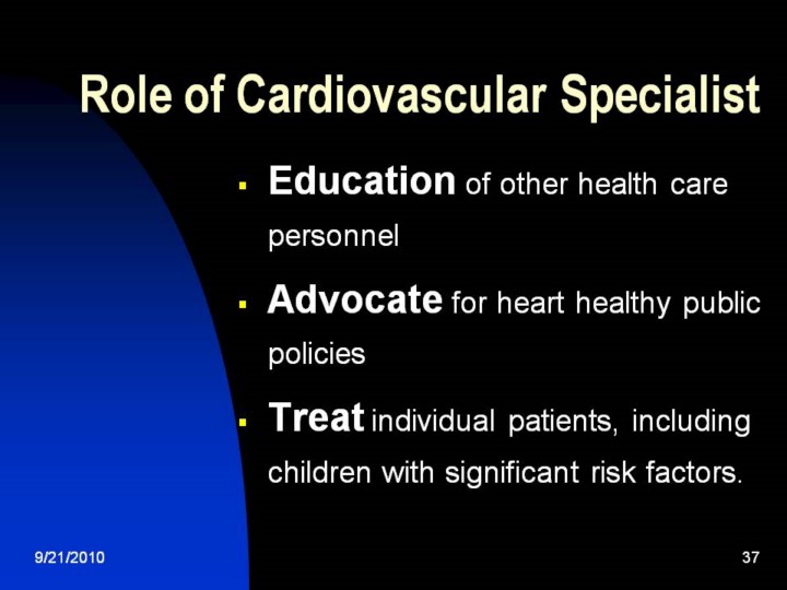 It will increasingly be the CV specialists who create and disseminate guidelines for primary therapy of the various risk factors for atherosclerosis – and that includes, Cerebrovascular, coronary, and peripheral vascular disease. Advocacy: CV specialists must be leaders in creation of heart-healthy public policies. Governments listen when specialist societies recommend changes in legislation in the public interest, be it food labeling, restriction of salt and other additives, school lunch programs, or community recreation facilities. Advocate in your schools for healthy snacks or meals if they are provided. Support daily physical education in the schools. This is one time when you must become involved in your community and country. I would add one further role of the specialist and that is to advocate for appropriate data collection and surveillance so that healthy public policies are actually evidence-based. Finally, CV specialists see individual patients but have role in prevention within families. It will be up to you to treat children referred for therapy of elevated risk factors. Remember the moniker EAT – it is one of the few times that I will be advocating such an approach for CVDs! |