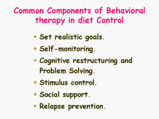 maintaining the weight loss. The initial goal of therapy should be to achieve a 10% reduction in body weight. Patients should be encouraged to lose 1-2 lb/week and thus should be able to achieve 10% reduction within the first 6 months of treatment. Subsequently, efforts should be directed at maintaining the weight loss. Recent studies suggest that patients often desire to achieve much greater weight losses than this 10% goal [19]. What patients report as a "dream" weight would be accomplished by a 38% reduction in body weight; a weight that would make them happy, would be accomplished by a 31% reduction in weight; a weight that would be "acceptable" would be accomplished by a 25% weight loss, and a weight that they would be disappointed to achieve would be accomplished by a 15.7% weight loss. |