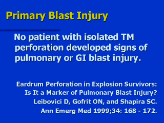 | Perforated Tympanic Membrane can serve as a surrogate for potential life threatening injures but contrary to previous dogma, an isolated perforated TM might not be indicative of pulmonary and or GI blast injury. |