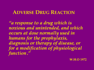 Adverse Drug Reaction is officially described as "a response to a drug which is noxious and unintended, and which occurs at dose normally used in humans for the prophylaxis, diagnosis or therapy of disease, or for a modification of physiological function". WHO Technical Report 1972