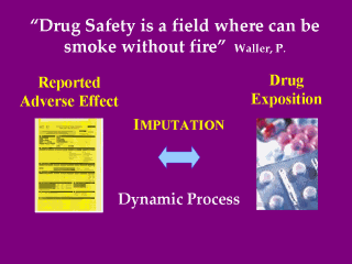 One of the most difficult components of safety monitoring is the causality assessment of reported adverse events, named "imputation". Imputation does not prove a causal relation. It's a dynamic process of causal inference thorough continuous assessment of information considered on the differential diagnose of an adverse drug reaction.