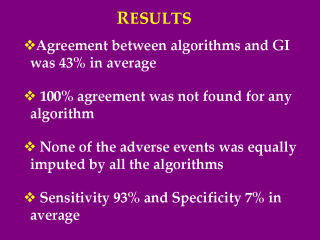 | Low rates of agreement between algorithms and GI were found (average 43%). Total agreement was not found for any algorithm. None of the adverse events was imputed equally by all the algorithms. Algorithms presented high rates of sensitivity (average of 93%) and low rates of specificity (average of 7%). |