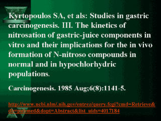 | Kyrtopoulos y cols. determinaron a través de un estudio in vitro de jugo gástrico, que la formación de productos de N-nitroso requiere un incremento gradual de la acidez hasta Ph menor de 3, que depende en primer orden de la concentración de nitritos y que el proceso actúa con mayor rapidez con un pH de7. Estas observaciones son compatibles con la formación de compuestos de N-nitroso a causa de la interrelación de nitrosaminas con el jugo gástrico. |