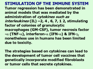 the thoracic cavity with minimum toxicity. Another advance is to make tumor cells more immunogenic by the transfer of costimulatory molecules like B7-1 & B7-2 that do not found in the tumors and are necessary for effective recognition of the tumoral antigens by the immune system. Among the advantages gained by using this type of therapy is that antitumor protection is gained for a long time, nevertheless with certain difficulties like the unpredictable expression of costimulitory genes and tumor antigens like the loss of immune response. |