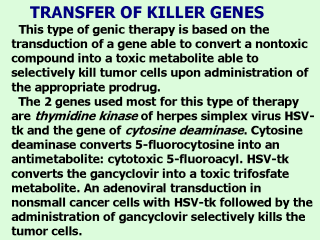 production of HSV-tk only in the cells overexpressing CEA. In a murine model of lung cancer with metastases in the liver utilized an adenoviral vector to transfer the gene of thymidine kinase of herpes simplex, and the gene of Interleucin 2 (IL-2), the treatment followed by gancyclovir resulted in a significant regression of the tumor and prolonged sursival.