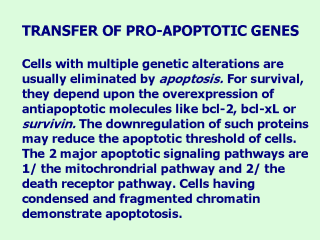 pro-apoptótic genes Bax, Bak and the antiapoptótic genes Bcl-2 and Bcl-XL. The transfer of the genes Bak & Bax induces high levels of apoptosis in cancerous cells from the lung independently of the status of p53. Another gen that induces apoptosis is the gene fas, occurring in patients with NSCLC that have better survival with its overexpression mediated by adenovirus inducing apoptosis in tumor cells. Nuclear factor kappa B (NF-kB) is another inhibitor of apoptosis. See also Ambrosini et al (Nat Med 3: 917-921, 1997) and Olie et al (Cancer Res 60: 2805-2809,2000). |