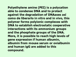 PEI favors high levels of expression of a transgene after administration by aerosol, with toxicity and cytokine response minimum and without acute inflammation. Via this type of system, antitumeral effects have been attained in 2 different cancer models using the suppresser gene p53. An aerosol system has been used in the murine melanoma B16-F10 for the administration of the PEI-p53 complex, achieving significant tumor reduction and a 50 % increace in survival. The mechanism of these p53 antitumoral effects is due in part to the supression of angiogenesis, due to the overregulation of the angiogenic factor thrombospondine 1 (TSP-1) in the lung tissue and under low regulation of the vascular endothelium factor (VEGF). |