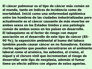 predisposición de la carcinogénesis asociada al tabaquismo. También se ha visto que existe una predisposición genética para el cáncer pulmonar, así como ciertos factores en la dieta que se han nombrado como moduladores de riesgo potencial como un consumo alto en grasas y un efecto protector de las vitaminas A, C y E. |