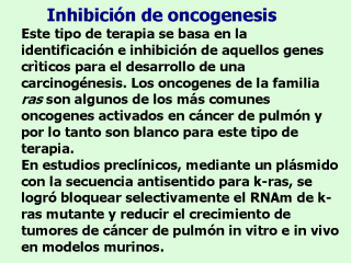 la tumorigenecidad. Ver también Ambrosini et al (Nat Med 3: 917-921, 1997) y Olie et al (Cancer Res 60: 2805-2809,2000). El oncogén HER-2/neu codifica una proteína trasnmembranal con activiad de tirosina kinasa y se encentra sobreexpresado en muchos tipos de cánceres y se ha correlacionado con un mal pronóstico y quimioresistencia en cáncer de pulmón. El producto del gen temprano 1 A del adenovirus tipo 5 (E1A) puede inhibir la expresión de HER-2/neu , con ésta estrategia se ha logrado la inhibición del crecimiento intratraqueal de célula cancerosas de pulmón en un modelo murino. Otro gen potencial que se ha estudiado es el factor de crecimiento tipo insulina 1 (IGF-Ir), en un modelo murino utilizando un adenovirus como vector de una secuencia antisentido se logró una sobrevivencia prolongada. Otros genes que también se incluyen son el receptor del Factor de Crecimiento Epidermal (EGFR) que se encuentra en el cromososma (7p12), los cromosomas 5 y 6 también son usados como marcadores para cancer pulmonar cuando su número de copias son ±2 esta detección se realiza por DNA fluorescente en la prueba de hibridación in situ (FISH). |