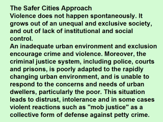 | The criminal justice institutions alone cannot stop the escalation of urban violence or even control it. Public safety should be considered as a public good that must be developed and promoted by all institutions and civil society. International experience shows that reducing crime is everybody's responsibility. |