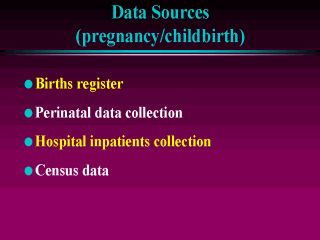 pregnancy and childbirth, we can access the following data sources: 1) births register: as a statutory data set (compulsory notification) it is updated regularly and it contains demographic information that may not be available from other sources, such as ethnicity and age of parents, indigenous status, etc. Access via the office of births and deaths, but also via organisations who already have an arrangement and confidentiality agreement. 2) Perinatal data: collected at hospitals or other birth centres by nurses and midwives. Items include details of the pregnancy and birth including birth defects, as well as some medical history of the mother during pregnancy. Access by health institutions who have an agreement to handle individual records. 3)Inpatients data: covers demographics, cause of admission, other diagnoses and procedures performed, length of stay, discharge status, insurance status, etc. Only Health Departments (Ministry of Health) and authorised government institutions (national research centres) have access to de-identified data. 4) Census data: available to all institutions purchasing it: de-identified and contains socio-demographic information for all residents at the time of census. Updated every five years. Intercensal population estimates projected for all other years. |