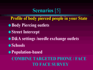 3)If your hypothesis is that piercing is more popular among alcohol or drug users, conduct interviews at the drug and alcohol clinics or needle exchange program outlets.