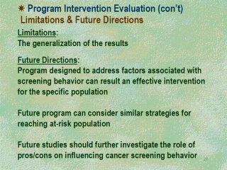 Hou, S., Fernandez, M., Baumler, E., & Parcel G. (2002). Effectiveness of an intervention to increase Pap test screening among Chinese women in Taiwan. Journal of Community Health, 27(4), 277-290.