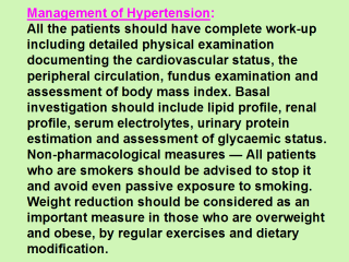 Sodium restriction and substitution of sodium by potassium salt may be useful. Reduced intake of saturated fat and cholesterol and increased intake of fibers and omega3fattyacid are beneficial. Supplementation of calcium may reduce the systolic pressure by 1.8 mm Hg and diastolic pressure by 0.7 mm Hg. Lifestyle modification, not only helps blood pressure control, but also is useful in glycaemic and lipid control. Type 2 diabetics are relatively resistant to antihypertensive drugs in view of the associated obesity and hyperinsulinaemia, and many will require at least three drugs for tight blood pressure control. Isolated systolic hypertension in the elderly is dangerous & should be treated. Aggressive lowering of blood pressure is required in patients with risk factors.