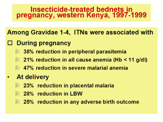 In summary, this study involving 3170 pregnant women of all gravidae groups living in an areas of intense malaria transmission showed that women in bednet villages had less malaria and anemia during pregnancy, and at the time of delivery, particularly in the first 4 pregnancies. In this group the mean birth weights and gestational ages were higher, and the prevalence of low birth weight was reduced by 28%, and of any adverse outcome, including fetal loss by 25%.