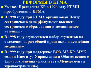2-х лет). - Постановлением Правительства КР от 3 апреля 2000 года № 178 «О Государственной программе Реформы» высшего медицинского и фармацевтического образования в КР на 2000-2004 годы определено дальнейшее реформирование системы высшего медицинского образования. - Впервые в Центральноазиатском регионе на контрактной форме обучения факультета «Лечебное дело» с 1-го сентября 2001 года введена новая учебная программа по модульным технологиям. |