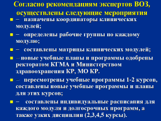 - выделен один модуль «Введение в клинику» для изучения в 4-м семестре и девять для изучения на 3-м курсе: «Сердечно-сосудистая система», «Кроветворная система», «Респираторная система», «Скелетно-мышечная система», «Эндокринная система», «Желудочно-кишечный тракт», «Мочеполовая система», «Репродуктивная система», «Нервная система»;- проведены соответствующие мероприятия на 4 курсе: долгосрочное клиническое обучение по 4 разделам– «Терапия», «Хирургия», «Акушерство и гинекология», «Педиатрия».- 5 курс – клиническое обучение по узким разделам;- Начата разработка 6 курса обучения по интегрированной системе обучения |