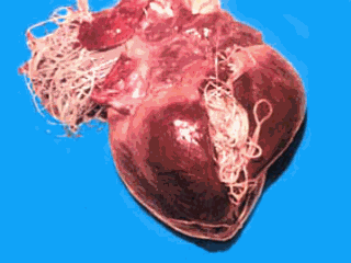 particularly the lungs, liver and kidneys. Of course, much more work for the heart results. Therefore, tachycardia (rapid pulse) and dysnea (shortness of breath) are typical. Blockage of major blood vessels can cause the animal to collapse suddenly and die within a few days. Sudden destruction of large numbers of mfs occasionally causes severe shock-like symptoms that may kill the dog. Most dogs can be treated successfully if heartworm disease is detected early by blood tests. Other diagnostic tests include radiography and electro/echo-cardiography. Human filariasis, mostly in Africa and Asia, is discussed in Filariasis: http://www.pitt.edu/~super1/lecture/lec10971/index.htm |