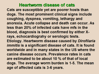 Larvas migrate to the heart and pulmonary arteries where they mature. Mismigration of mfs to sites like the brain occurs occasionally. The lesions of endarteritis caused by adult heartworms are similar to those seen in the dog. The immune response which appears to be much stronger in the cat than in the dog may be sufficient in many cats to destroy the invading mfs and thus prevent spreading infection. Clinical Features. Clinical signs are absent to severe. A small worm burden can cause chronic vomiting, coughing, dyspnea, respiratory failure and weight loss. The infection is sometimes confused with bronchial asthma. Six to 10 worms may cause right side heart failure. When the disease is acute there may be convulsions, diarrhea, tachycardia and collapse. Diagnosis - This is sometimes more difficult in the cat because of the absence of mfs. ELISA procedures are available for detection of antigen and antibodies. As in the dog radiography and echocardiography are useful. Treatment. The use of an adultacide such as thiacetarsamide IV may be accompanied by pulmonary thromboembolism and a mortality of 20-30 %. Various drugs are used for supportive therapy including prednisone or prednisolone to reduce inflamation, theophyline for bronchial dilation and inflamation reduction and lifesaving supplemental oxygen.Control. Cats are usually tested for antigens before beginning prophylactic medication which involves monthly administration of ivermectin in tablet form to cats 6 weeks or older, or selamectin (Revolution) applied topically. These and several other drugs kill the larvas of D. immitis. |