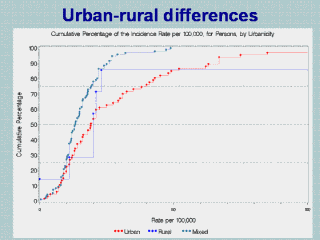 | We identified 21 discrete-core studies with rates from urban sites, 3 studies from rural sites, and 42 studies with mixed urban-rural catchment areas. Two further studies provide rates for both urban and rural categories. Significance tests can only be constructed for differences between the urban and mixed categorizations. We found that studies conducted in urban versus mixed urban-rural catchment areas generated significantly higher rate distributions. |