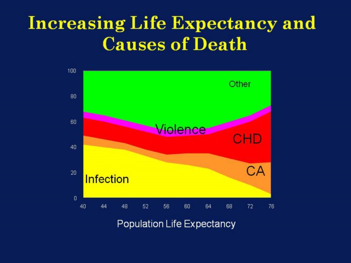 One of the most striking predictions by Omran is that given countries have the same life expectancy, there is very little difference in the causes of death. |
