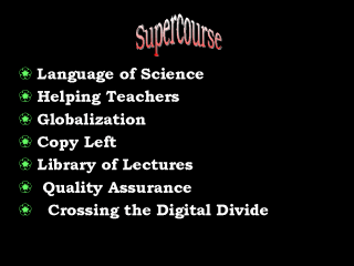 | The Supercourse is very different than any other form of learning. It is Internet Learning, and consists of 11 different components each one of which have rarely been used. All 11 components have never been used together, until now. This combination serves as a very powerful tool, for the manufacture, distribution and utilization of lectures. |
