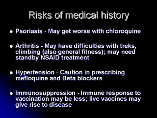 These risks may influence the advice or prophylaxis given in the pre-travel health consultation.