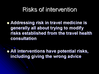 | Addressing risk in travel medicine basically relate to modifying risks established in the pre-travel or post-travel consultation. |