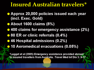 requiring hospitalization or aeromedical evacuation during travel. Leggat PA, Griffiths R, Leggat FW. Emergency assistance provided abroad to insured travellers from Australia. Travel Medicine and Infectious Disease. 2005; 3: 9-17.