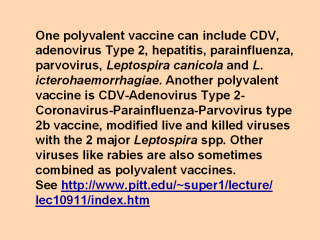 | The pathology of CDV in the CNS is similar to that of children with subsclerosing panencephalitis caused by measles and often fatal. T cells (lymphocytes) from the bloodstream carry the CDV into the CNS, crossing the blood-brain barrier. Measles vaccine is reviewed at http://www.pitt.edu/~super1/lecture/lec11551/index.htm. Also, measles & CDV have been fused (J Virol Aug 2004, 7894-7933). |