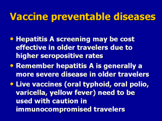 | Hepatitis A is probably the most common vaccine preventable disease of travelers. If older travelers have not been vaccinated nor have had the disease, they should be considered for hepatitis A vaccine. |