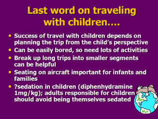 Some parents are tempted to use sedatives for their children. This should generally be discouraged. The effect of antihistamines is unpredictable. For younger children, taking a favourite blanket or pillow may assist sleep en route. If the child is sedated, it is important that the responsible adults avoid being sedated themselves.