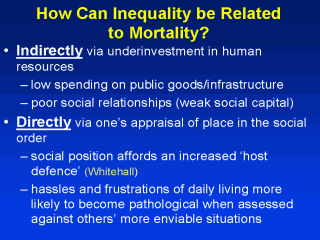 necessarily overly simplistic but are still useful. In the Kaplan study looking at the 50 U.S. states, they found that inequality was also related to spending on education, violent crime, number of library books per capita. Societies with wider income distributions also tend to have weak social ties and poor community life - or to borrow Coleman’s term, they have weak social capital. The second mechanism has to do with one’s appraisal of place in the social order. Even if you live in a society where all your basic needs are met, if there are large income differentials, you will perceive yourself as being more deprived than would someone with even lower absolute income living in a poorer but more egalitarian society. To quote a Globe and Mail article from Tuesday this week “Poverty is worse in the United States than it is in Namibia. In the U.S. they know the difference.” The argument follows that prolonged exposure to a society where there’s a big difference in terms of lifestyle, choices and control between those on the top and those on the bottom is stressful and directly health damaging, especially to those on the bottom. |