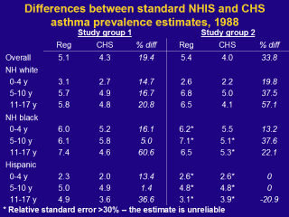 This table shows the results for study group 1 and study group 2. The estimates marked with an asterisk (*) have a relative standard error higher than 30% and are unreliable--while we can use them to measure the differences between the results for the different survey questions, they should not be used independently as estimates of asthma prevalence. The overall results for study groups 1 and 2 are shown on the first line of this table. For study group 1, the standard NHIS question yielded an asthma prevalence of 5.1% whereas the CHS questions yielded a prevalence of 4.3%. The standard NHIS question therefore gave an estimate 19.4% higher than that of the CHS two-part question. The difference for study group 2 was even greater, 33.8%. When the sample is stratified by race and age group, in almost every case, the estimate from the standard NHIS single question yielded a higher asthma prevalence estimate than the two step question from the CHS. The exception was for Hispanic children in study group 2. Recall that study group 2 was the group that received both the standard and the CHS questions. For this group, the estimates were the same or lower in the standard NHIS compared to the CHS, depending on the age group. This is somewhat surprising given that the greatest differences seen between the 1995-96 (old NHIS) and the 1997 (new NHIS) estimates were seen for Hispanics. One possible explanation is that the composition of the Hispanic population in the US changed between 1988 and 1995-97. The small sample sizes for Hispanics in study group 2 and the resulting unreliable estimates are another possible explanation of the contrasting results for this group. |