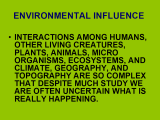 | "Changing patterns of disease are related to the ways we interact with ecosystems and the earth's life-support systems with which we are interdependent. Human actions are responsible for some, perhaps even most of the recent changes, for the worse as well as for the better, in the pattern of infectious diseases" John Last, 2001 |