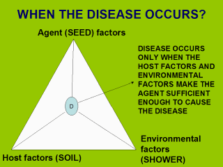 SIMILARLY, THE DISEASE OCCURS ONLY WHEN THE AGENT (SEED) FINDS A SUSCEPTIBLE HOST (FERTILE SOIL) AND FAVORABLE ENVIRONMENT (SHOWER) FOR INTERACTION.