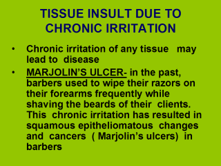 Cancer lip is more seen with chronic smokers due to chronic irritation of the delicate lip mucosa, leading to purposeless neoplastic growth Cancer stomach is more seen with those people who insult their gastric mucosa with offending agents like drugs, hot and spicy foods, alcohol etc. Cancer larynx is frequently seen with singers and teachers. who abuse their voices. Personal experience. My own maternal uncle, who developed a habit of folding and twisting the skin on his Adam's apple for 40 years developed epithelioma of skin there and died. Hence God given tissue should be respected because that greatest engineer has included in each cell, all the necessary ingredients of life. |