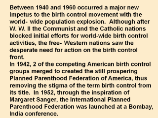 control safe, effective, and simple to use. Once again Margaret Sanger took a leading role in providing this breakthrough, not through her scientific skills but through her contacts with the wealthy in the American birthcontrol movement. Since WWII great strides had been made in developing the new field of endocrinology, learning about the body's system of hormonal regulation, and under standing sexual physiology. By the 1950's both endocrinology and steroid chemistry had progressed sufficiently to allow for the development of a hormonal contraceptive. |