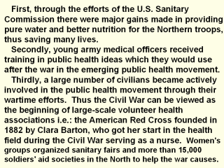 written for the general public were widely distributed during the war. Fiftly, women were brought into the health care field in large numbers for the first time as nurses and, as just mentioned, as leaders of voluntary health associations. The individual Civil War soldier was taught a limited amount about personal hygiene, information he could use after the war. Seventhly, the Civil War firmly established that the federal government was supreme in the United States rather than the state governments. This point would allow federal governmental intervention into public health issues. in the 20th century. If the South had won, public health reform would have been doomed, as state governments in both the North and the South proved unable to solve interstate public health issues for the remainder of the 19th century. Even today state governments are ineffective in dealing with interstate public health concerns. |
