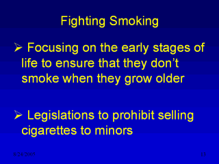 life because: - Behaviors originate from values. Therefore, it is important to develop healthy values at younger ages - Behavior modification is easier and more effective at early stages compared to later stages of life In addition, smoking can be lessened by: - Activating the laws that prohibit smoking in public areas - Smoke-free transportations - Smoke-free schools - Not smoking in homes or in cars |