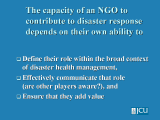 The capacity of an NGO to contribute to disaster response depends on their own ability to define their role within the broad context of disaster health management; effectively communicate that role; and ensure that they add value.