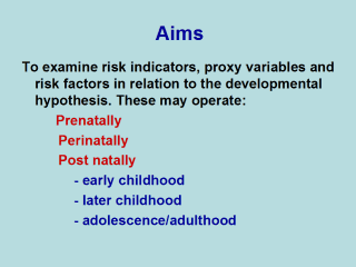 | Learning Objectives To understand that…. -schizophrenia has complex etiology involving genetic and environmental factors -many risk indicators, proxy variables and putative risk factors have been identified -these risk factors have varying degrees of empirical support but as "clues" they lead to further research Performance Goals Be able to distinguish between risk indicators, proxy variables and risk factors Be able to explain the role of risk indicators in schizophrenia Be able to explain the role of proxy variables in the etiology of schizophrenia Be able to explain the role of putative risk factors in schizophrenia |