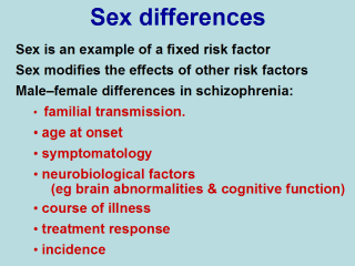 and raise or lower the threshold for the expression of symptoms. For example, a person’s sex is an important modifier of risk factors for schizophrenia; ie, sex modifies the phenotypic expression of schizophrenia. Eg, men and women differ in age at onset, symptomatology, neurobiological factors (familial transmission, brain abnormalities and cognitive function), treatment response, course of illness and incidence. The onset of schizophrenia is later and its severity less in women, giving rise to the hypothesis that being female is a protective factor. While male-female differences may result from sexual dimorphisms in schizophrenia-determining genes, they are more likely evolve from subtle shifts in protective and aggravating risk factors. It is currently unclear whether these risk factors have a biological and/or social origin. Eg biologically, men and women differ in hormonal and immune systems, and the pace of brain maturation. One or more of these factors may be critical to the timing of onset of schizophrenia and its progression. However, there is some evidence that gendered behaviour, not only genetic sex, can influence brain morphology: so perhaps the stress buffering that results from supportive social networks (more prevalent in young women than in young men) may delay onset, promote premorbid skill acquisition, and lead to a more favourable course. Interestingly, some of these differences may not hold in developing countries where the prevalence of schizophrenia has been found not to differ between males and females. |