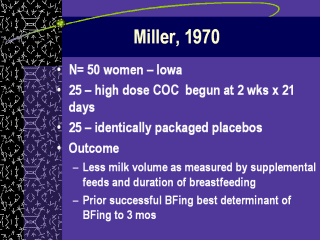 mic EE) Infants weighed from 1 wks to 5 wks before and after one AM feeding. Formula and cereal “allowed for supplementation”. Other problems: In group 1, 88% primips with no previous successful nursing as opposed to placebo where 30% had nursed before. Problems: Limited details about trial, indicates blinding but not how it was done, no allocation concealment mentioned. No sample size calc, no numerical results or graphs. Outcomes not quantified. |