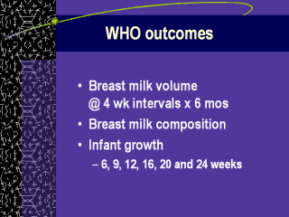 | Milk volume: Women admitted in AM and breastfed the baby. No Bfing x 2 hours, then baby fed from left breast while breast pump used to empty the right breast x 20 min. The expressed milk was measured and an aliquot taken for analysis of composition. No feeding x another 2 hours. Procedure reversed… Milk volume at 6 wk PP visit was baseline. |