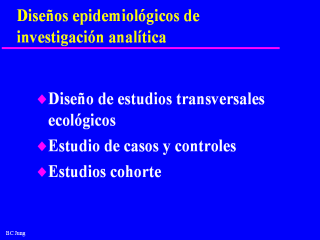 estudios más comunes en epidemiología, son: Estudio cohorte - estándar dorado cuando se explora la asociación entre un factor de riesgo o participación en un programa de salud, y resultados del status de salud o eventos de salud. Estudio de casos y controles - más comunmnete usado, menos costoso, cuando el resultado de interés es raro, y una muestra aleatoria de la población que produjo los casos. Involucra una evaluación retrospectiva de exposición diferencial entre dos grupos de comparación. Datos de toda la población - considerados como transversales, ya que la colección de datos de la exposición y el resultado son en un mismo punto del tiempo. Se consideran datos de prevalencia. Una relación entre exposición y resultado es la razón de dos tasas de prevalencia, o la relativa prevalencia. Diseños ecológicos - Datos de la exposción y la enfermedad son usados en forma conjunta y no pueden ser unidos al nivel individual. |