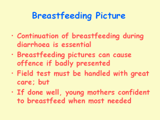 the African context or, at worst, even ridiculed. In Bangladesh, considerable work was undertaken to try to understand exactly what can (and what cannot) be shown in a breastfeeding scene. There, it was not considered problematic actually to show the breast itself but what troubled many people were the eyes and the expression of the mother when bonding with the suckling infant. Providing the mother’s eyes and expression are entirely neutral, the picture is usually quite acceptable. In some very conservative societies even this may not be enough – but providing there is trust between the agency developing the picture(s) and the technical ministry of the country concerned, what is acceptable can usually be quite quickly established. It should be remembered that both the administration and the consumers have to be satisfied over something as intimate as breastfeeding. This all said, it is important that breastfeeding be part of the ORT message since the statistics clearly show the huge benefits in terms of survival of infants suffering from diarrhoeal dehydration. In some tribal societies, there is a mistaken belief that fluids (including the breast) should be withheld during diarrhoea because the increase in fluid intake inevitably increases the flow of excreta, temporarily. If this belief is seen in the culture for which this pictorial material is being prepared, perhaps special mention should be made concerning the importance of giving the patient as much fluid as he/she wants – ORT, the breast and even plain, safe water as well. |