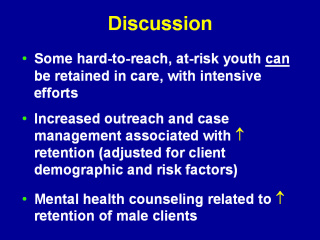 retained in care. Our study showed that increased outreach and case management services were associated with enhanced retention in care regardless of client demographic characteristics and level of HIV risk. Mental health counseling was clearly related to enhanced retention in care among males, and possibly among females. |