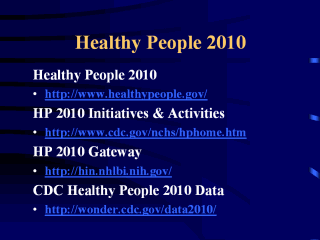 the progress being made towards resolving public health problems. The Healthy People process has managed to keep up with the times and provides a realistic approach to identifying and solving Public Health problems, and is open to input from Public Health professionals and the general public. For example, Healthy People 2000 set the national target of 100 per 100,000 coronary heart disease deaths for the U.S. It reset its goal to 166 per 100,000 for Healthy People 2010 because, as much as we would like to eliminate heart disease altogether, it is unrealistic to set such a low target, after reviewing whatever mortality data have been collected along the way. Additional links to Healthy People 2010 and related sources can be found at: http://www.bettycjung.net/Hp2010.htm Healthy People 2010 |